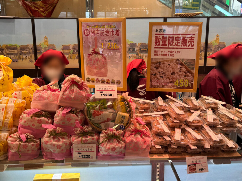 開店記念巾着の割引販売、お赤飯が数量限定販売されていましたよ!