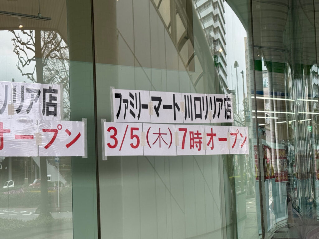 3月6日(金)現地へ行ってみると店頭に「ファミリーマート川口リリア店 3/5(木)7時オープン」と出ていましたよ!