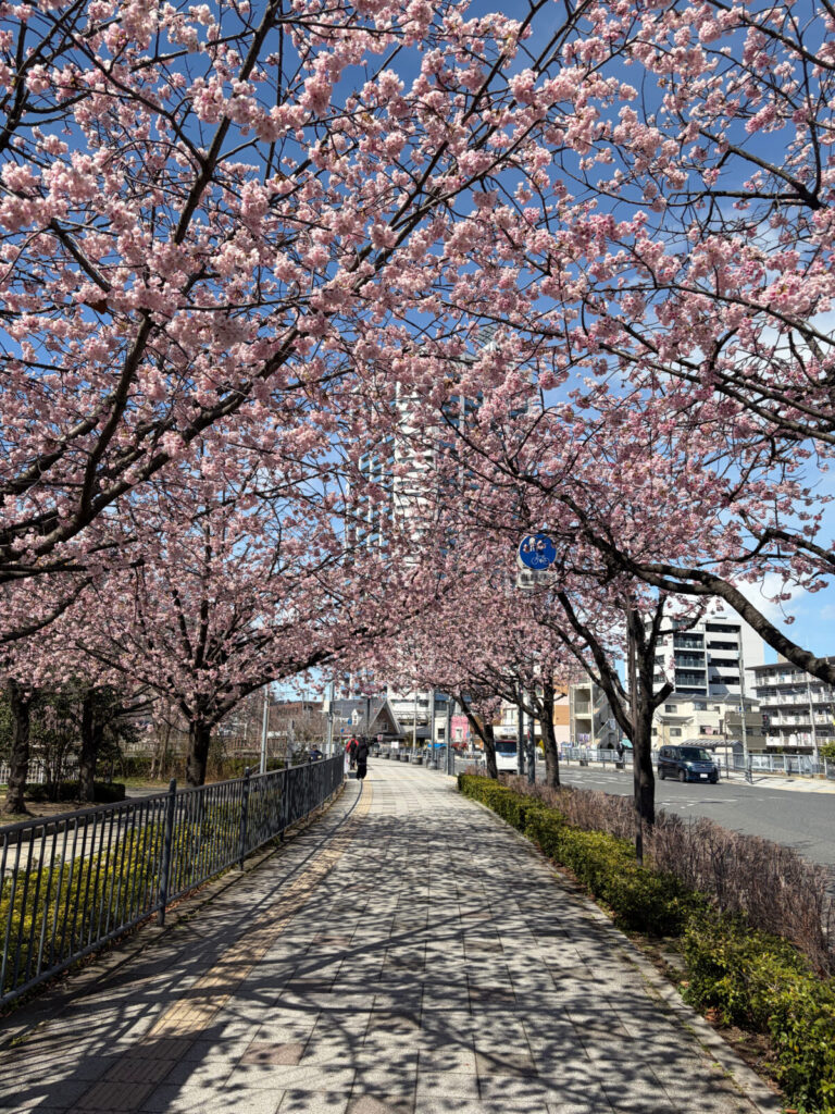 本日3月7日、川口元郷駅周辺で安行桜が見事に咲いていて、歩道をアーチ状に彩っていましたよ!