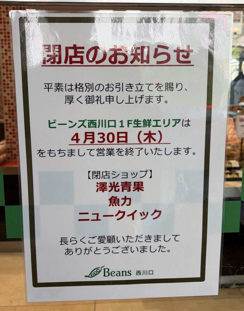 3月11日に現地へ行ってみると店頭に閉店のお知らせがあり、「ビーンズ西川口1F生鮮エリアは4月30日(木)をもちまして営業を終了いたします。」との記載がありました。