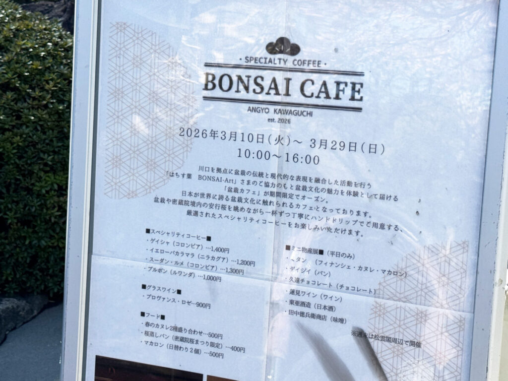安行原にある密蔵院に「BONSAI CAFE」が、3月10日(火)〜29日(日)まで期間限定オープンしているみたい!