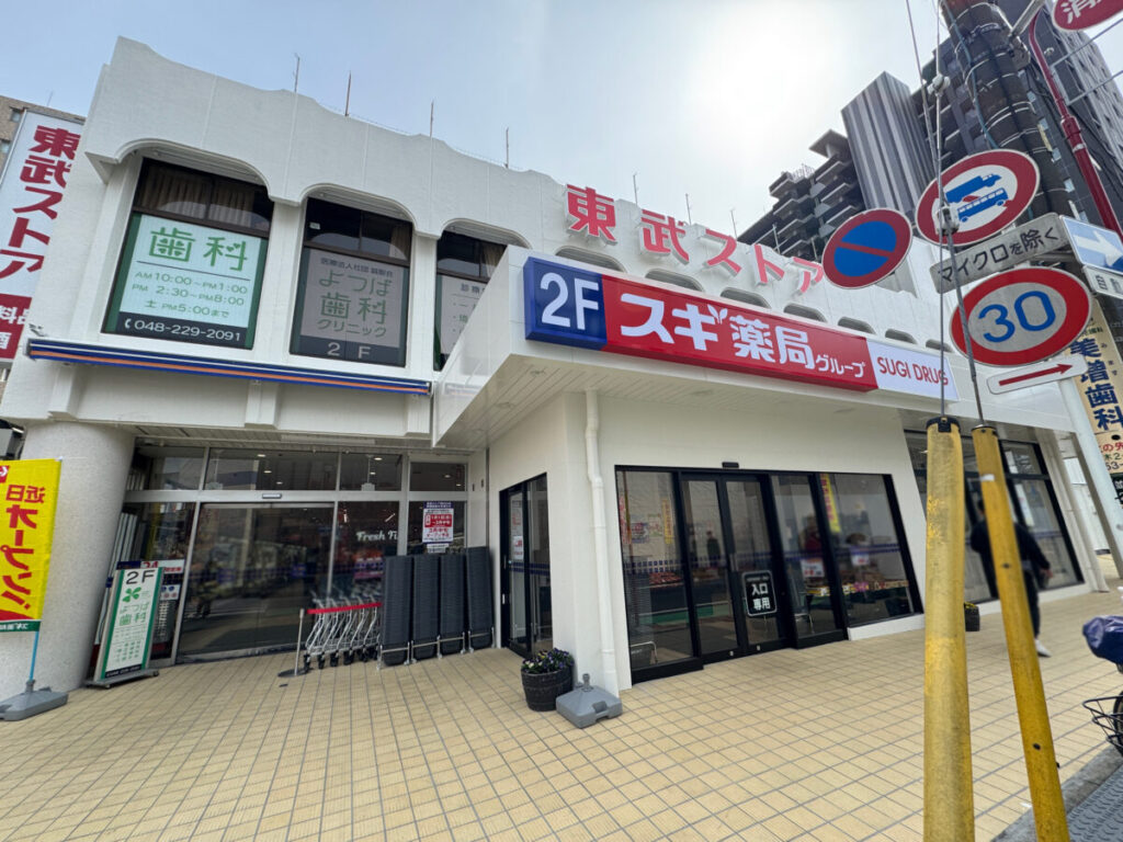 3月13日(金)現地へ行ってみると、東武ストアの外観に「2F スギ薬局グループ」という看板が取り付けられていました。
