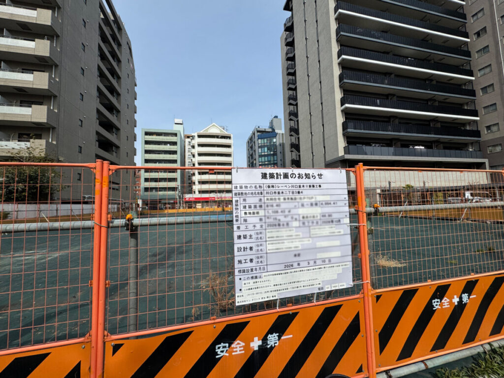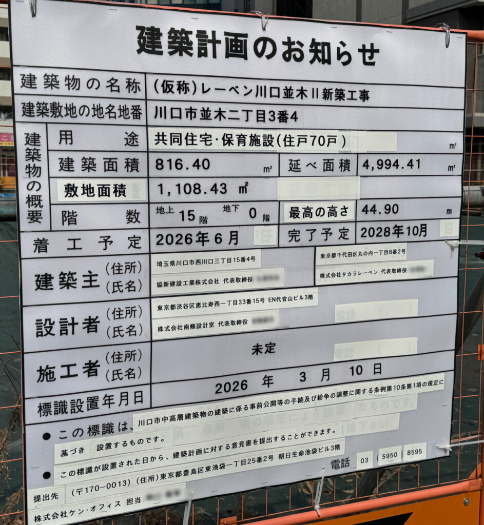 「(仮称)レーベン川口並木II新築工事」という名称で、共同住宅と保育施設の入った15階建の建物になるみたい。