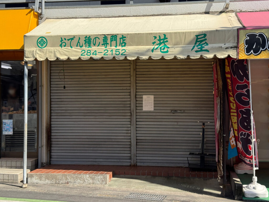 鳩ヶ谷にある、3月14日(土)をもって閉店したおでん種専門店「港屋」の店頭にお知らせが出ていました。