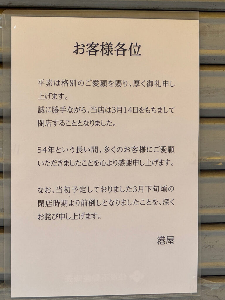 「54年という長い間、多くのお客様にご愛顧いただきましたことを心より感謝申し上げます。なお、当初予定しておりました3月下旬頃の閉店時期より前倒しになりましたことを、深くお詫び申し上げます。港屋」