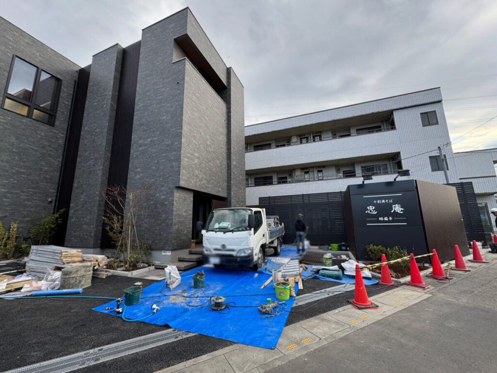 以前お伝えしていた、今春オープン予定の「十割舞そば 忠庵」新店舗に看板が付いていました!