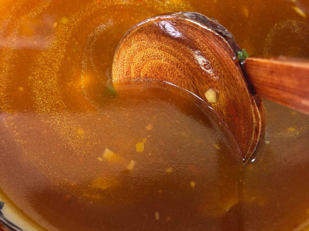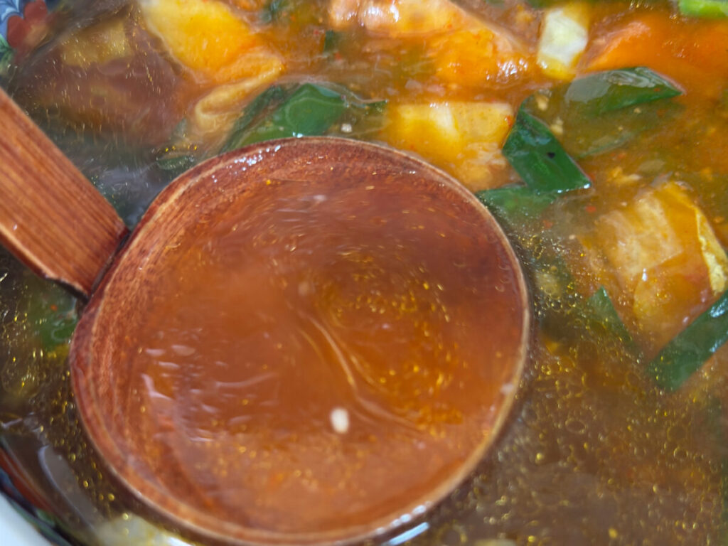 レンゲをスープに入れると、キラキラ輝く透明スープ!しかもとろみのある餡だ〜。まずはひとくち。