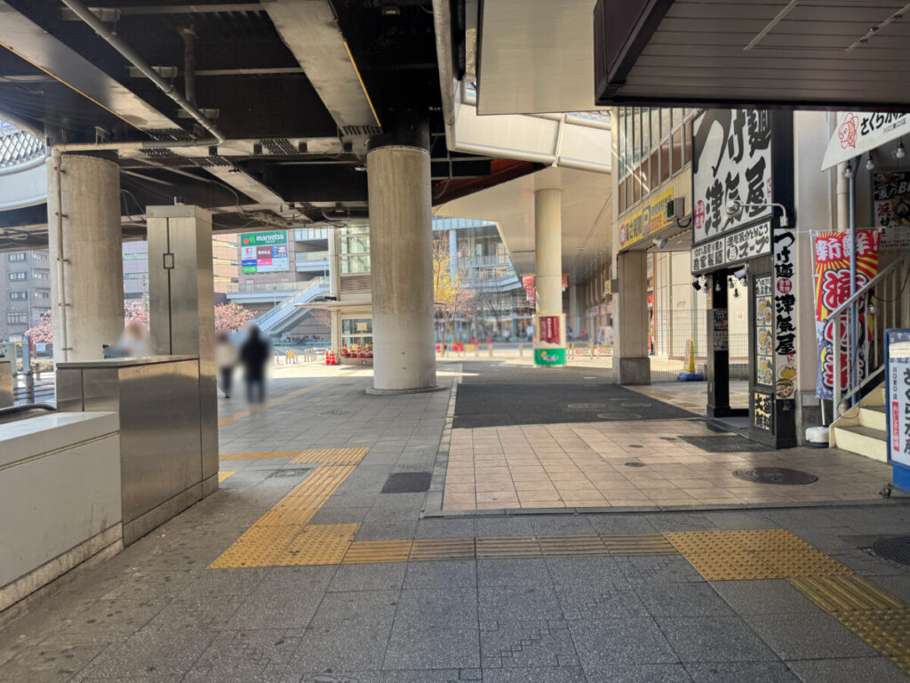 お店を背にして右はこちら。「津気屋 川口店」などがあり、突き当たりに「マルエツ」があります。