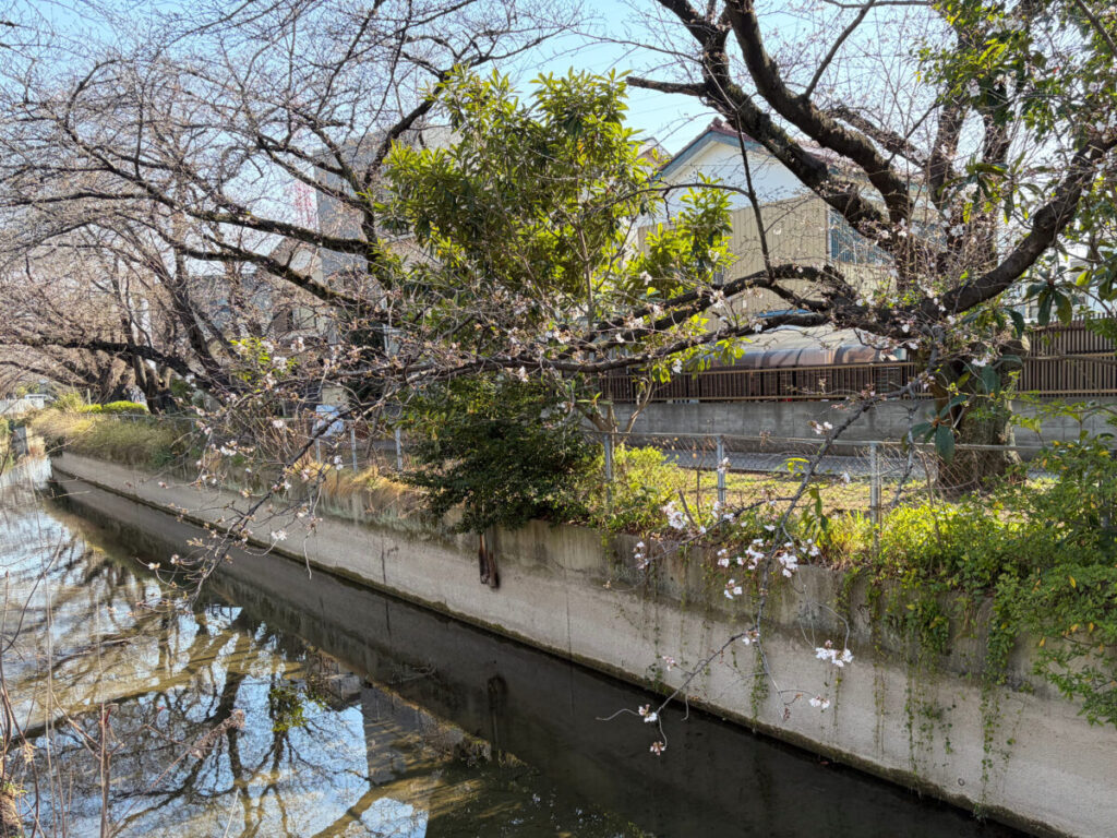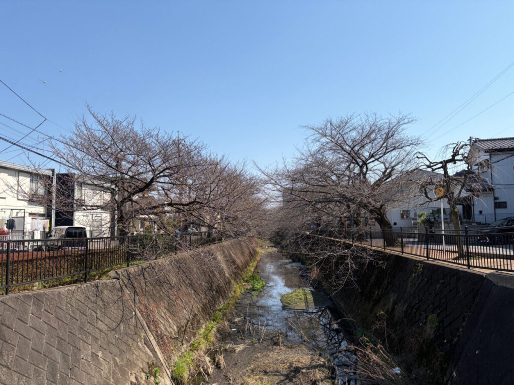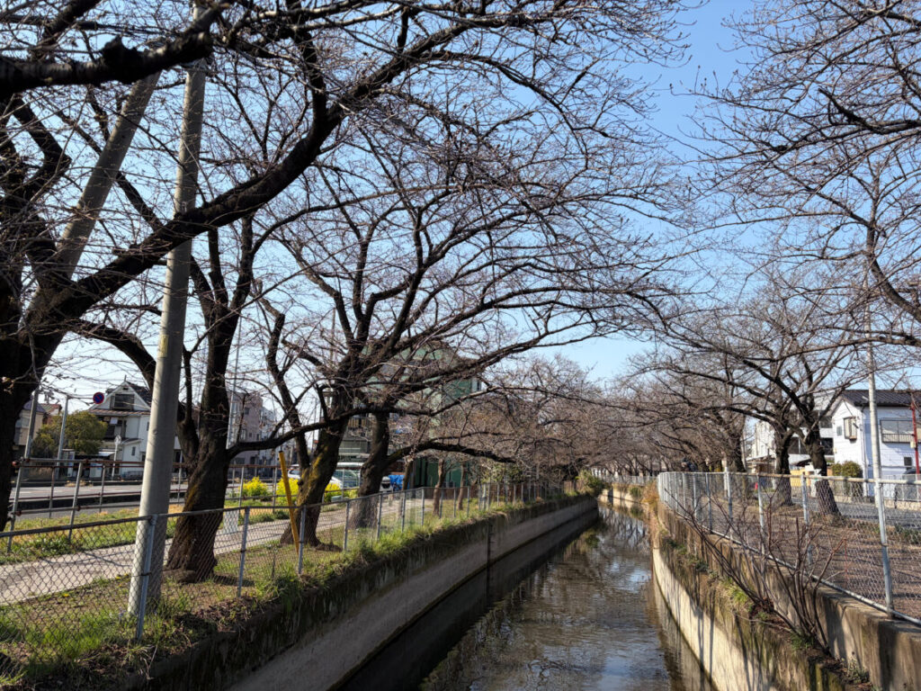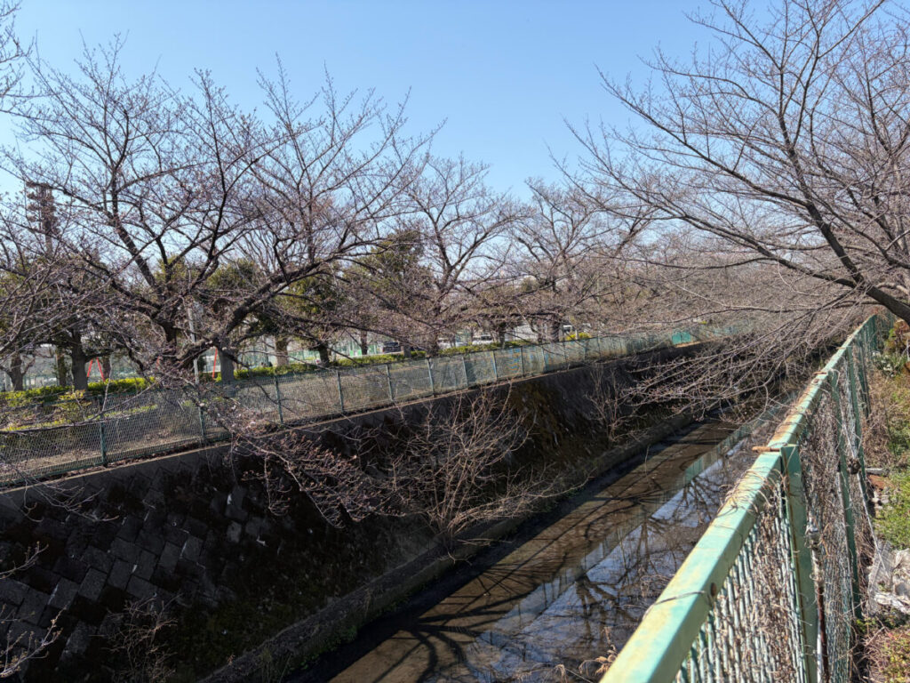 ソメイヨシノが両サイドから水路に手を伸ばしてる!けど開花はまだ。