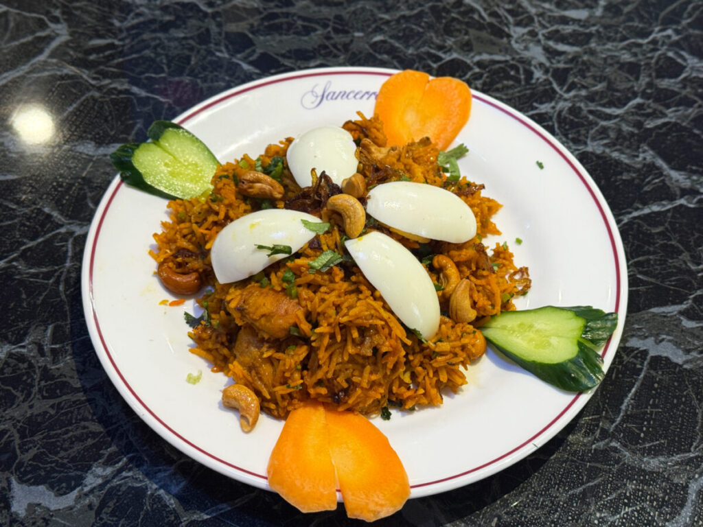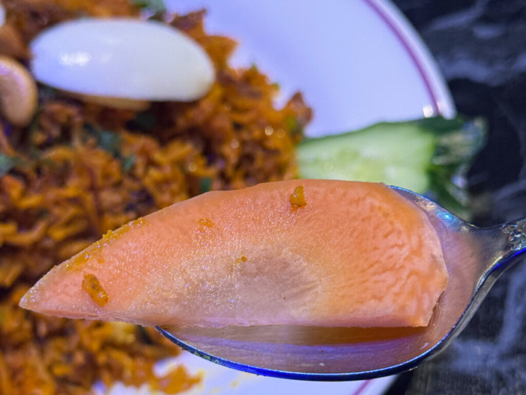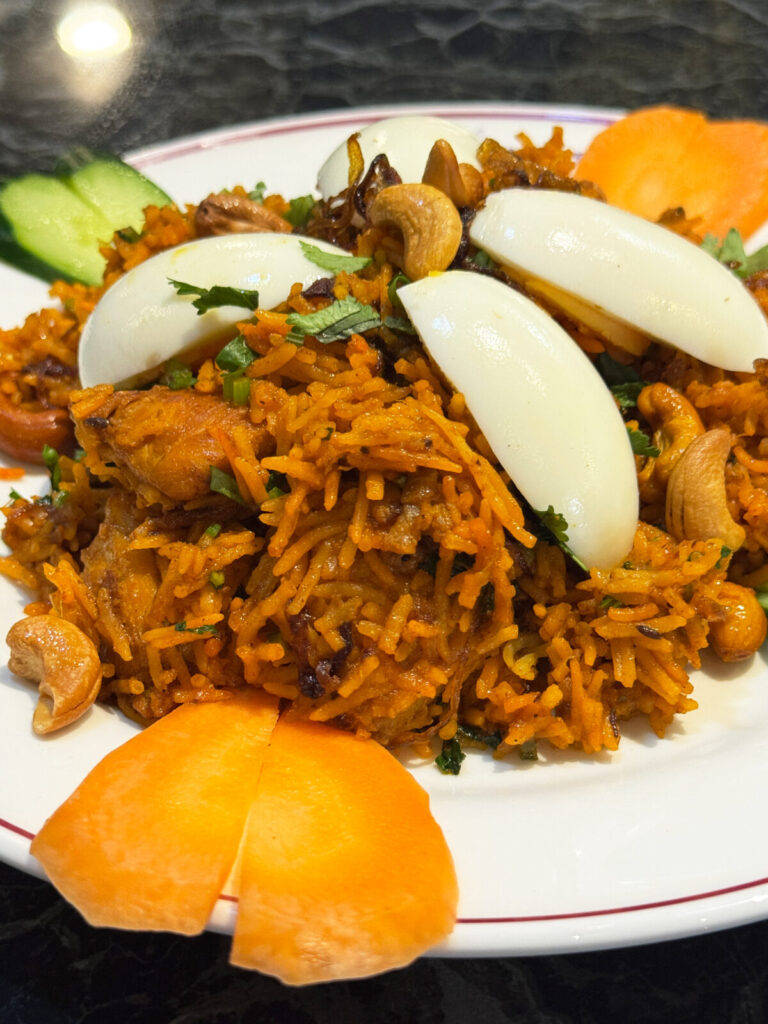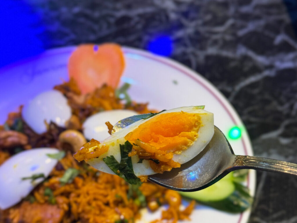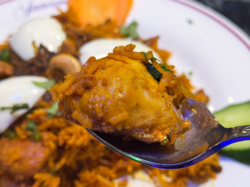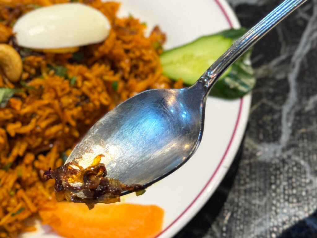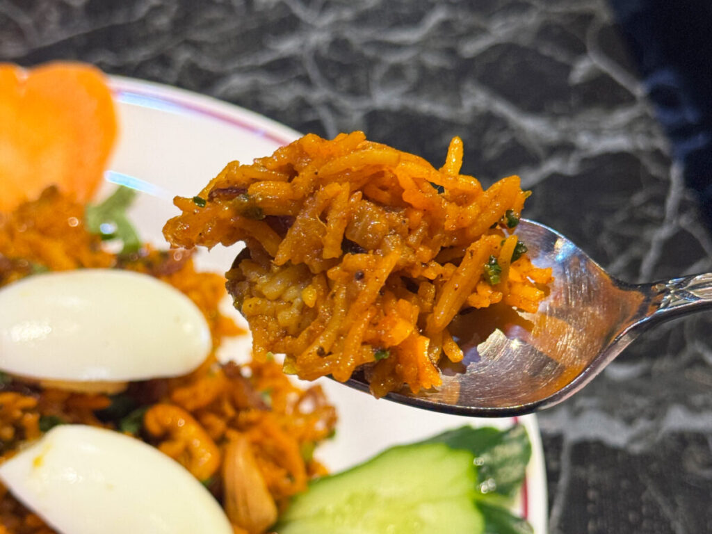 ふふふ。しっかり全体にカレーの風味が行き渡っていて、しっとり系のビリヤニ!