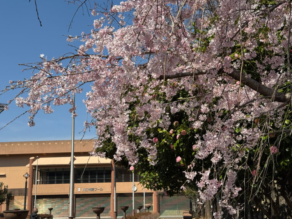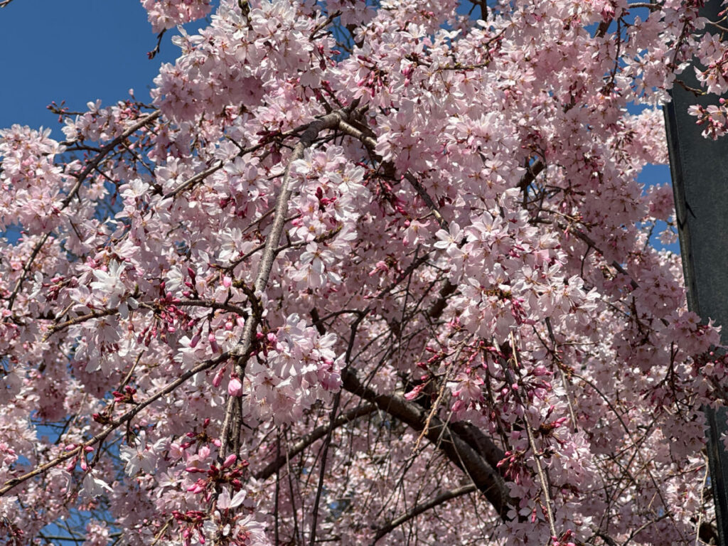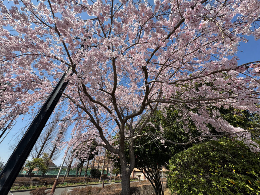 青木町公園にあるしだれ桜が、めっちゃ綺麗にほぼ満開に咲いていましたよ!3月24日(火)の様子です。