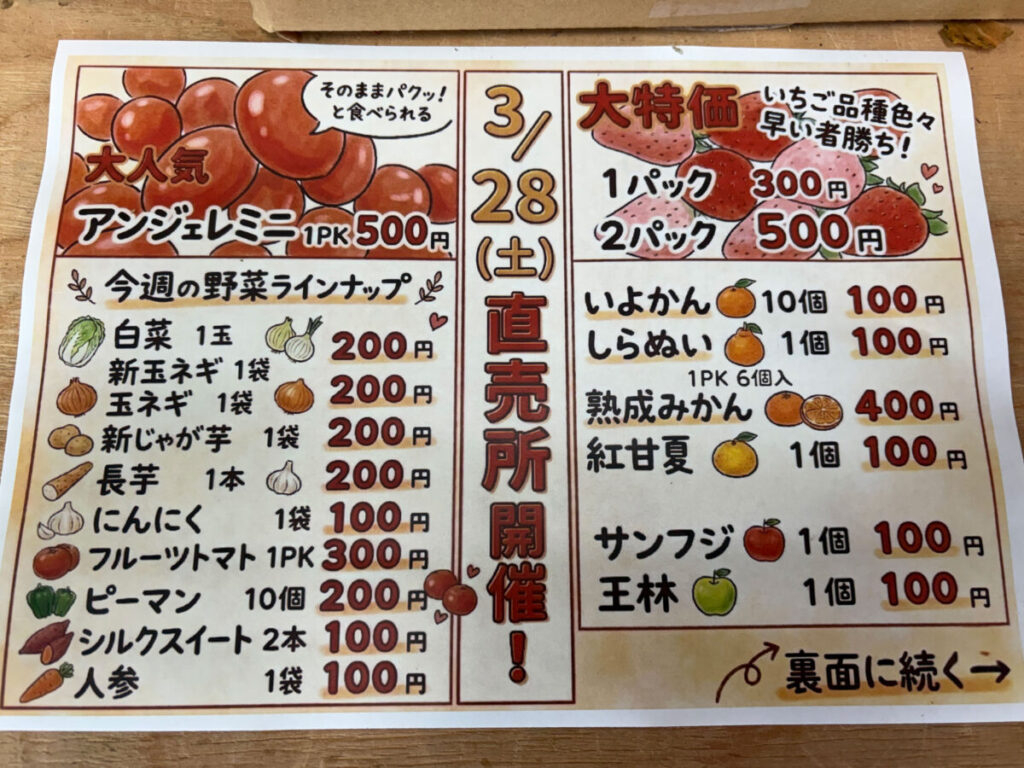お店の方によると、野菜直売所は毎週土曜日14時〜18時の営業(当面の間)。落ち着いたら徐々に日にちを増やして行きたいとのこと。