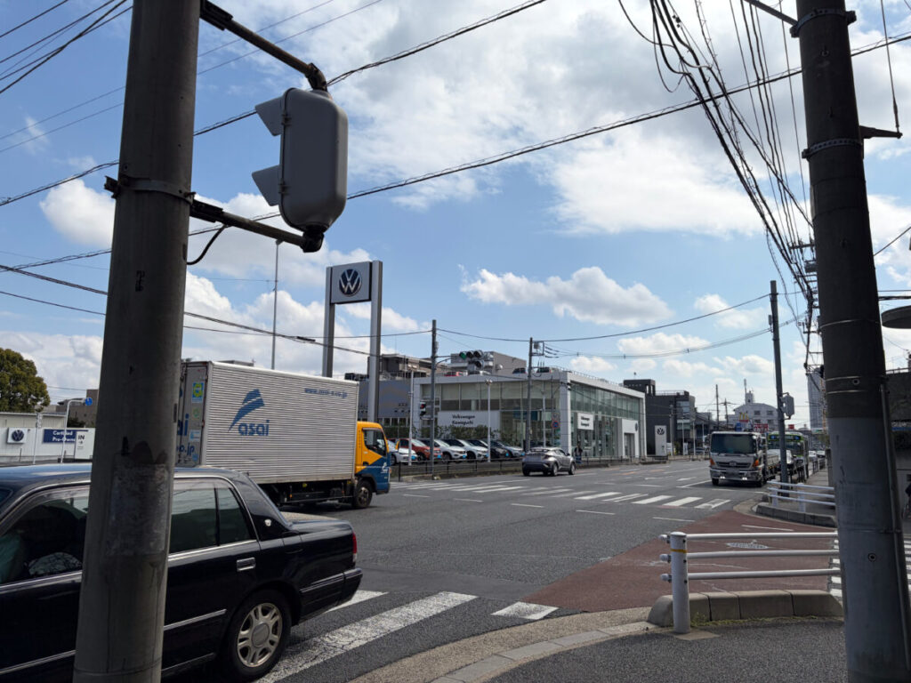 お店を背にして右はこちら。「青木信用金庫 朝日支店」や「フォルクスワーゲン」がすぐ近くにあります。