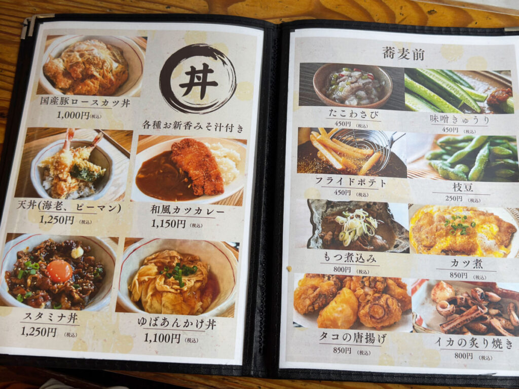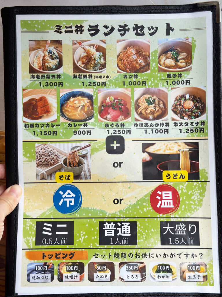 メニューはこちら。ミニ丼にそばorうどんがついてくるランチセットに、