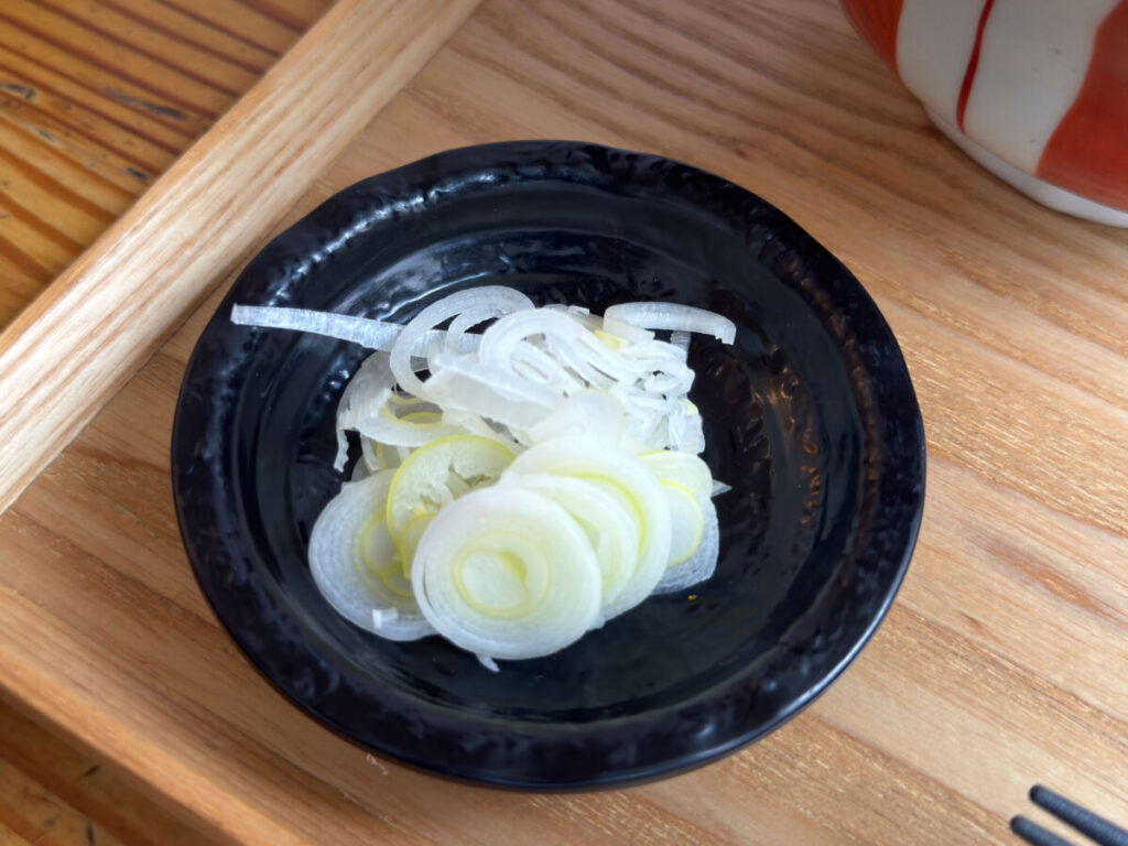 つゆの中には、しっかり肉感のある豚肉と、とろっとろの玉ねぎが。
