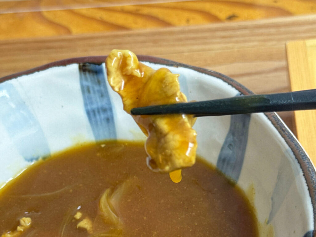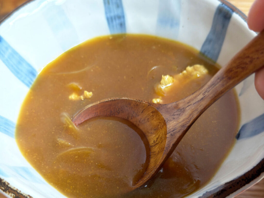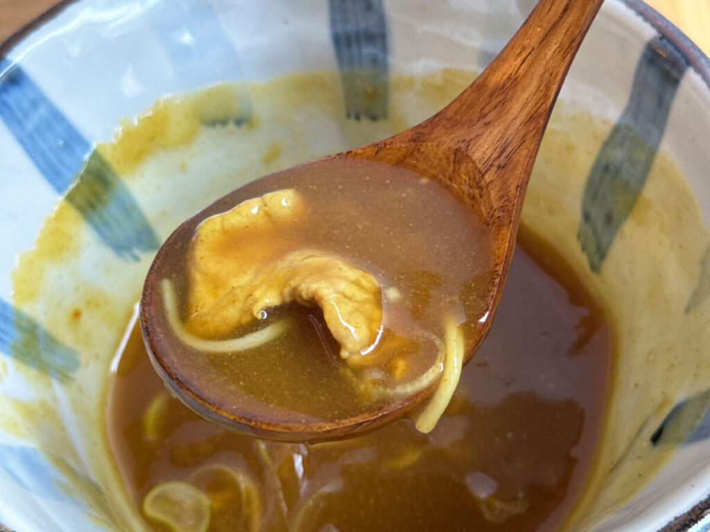 まずは、おつゆだけいただいてみよう。レンゲを入れると、弾力さえ感じるようなとろみのあるカレーつゆ!