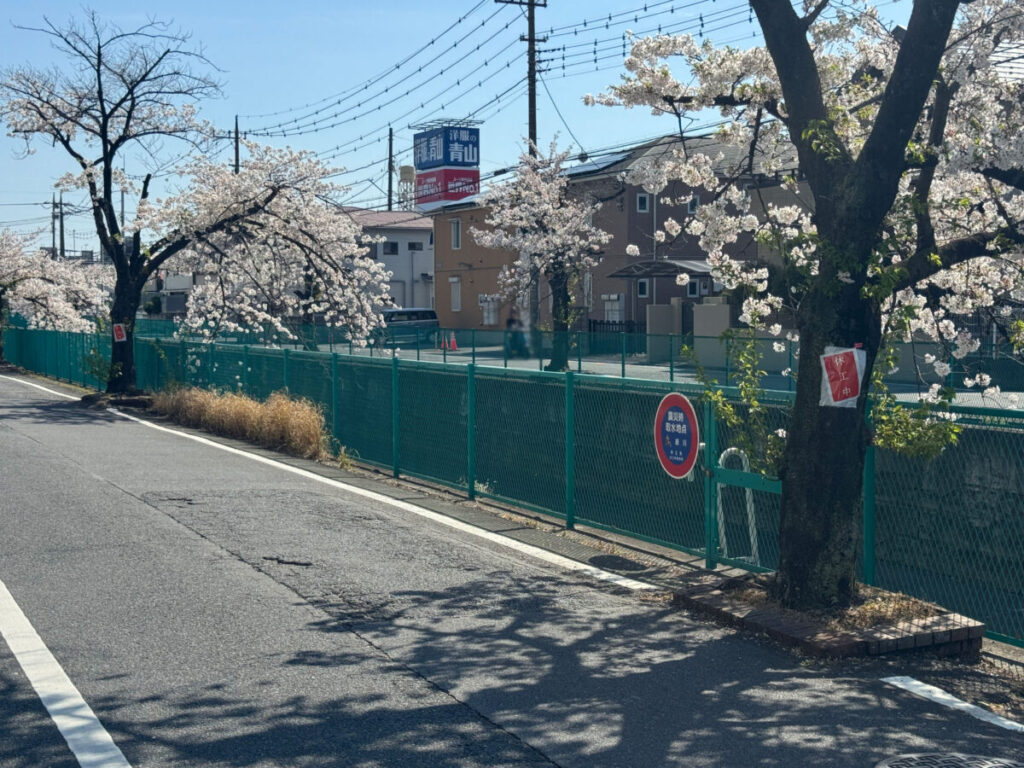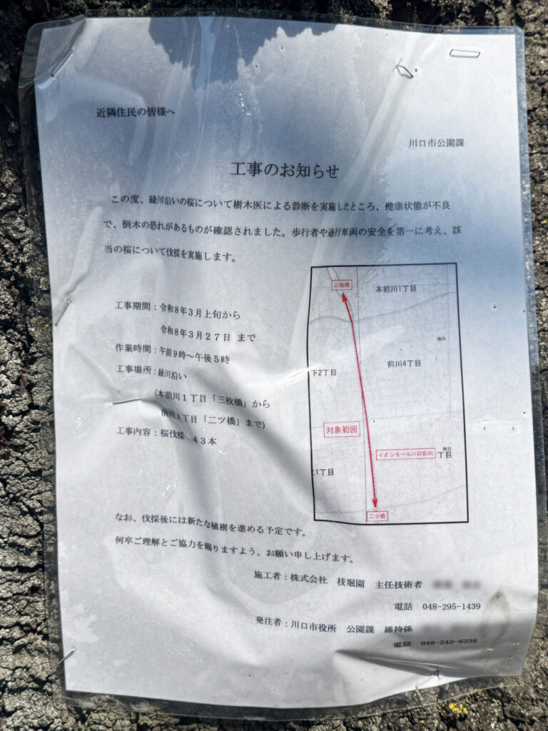 イオンモール川口前川の横を流れる緑川沿いの桜が伐採予定みたい。現地にお知らせがありました。