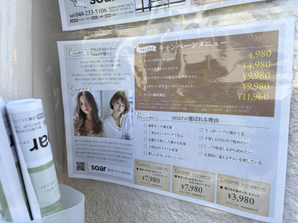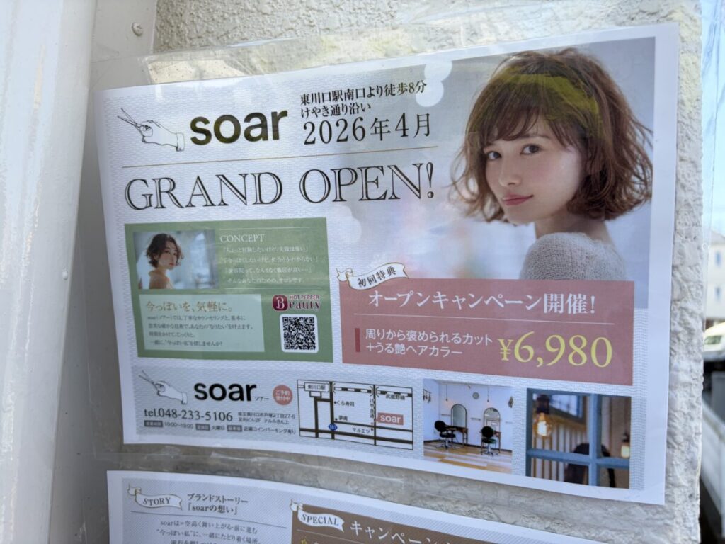 東川口のけやき通り沿いに「soar」という美容院が新オープンしてました。