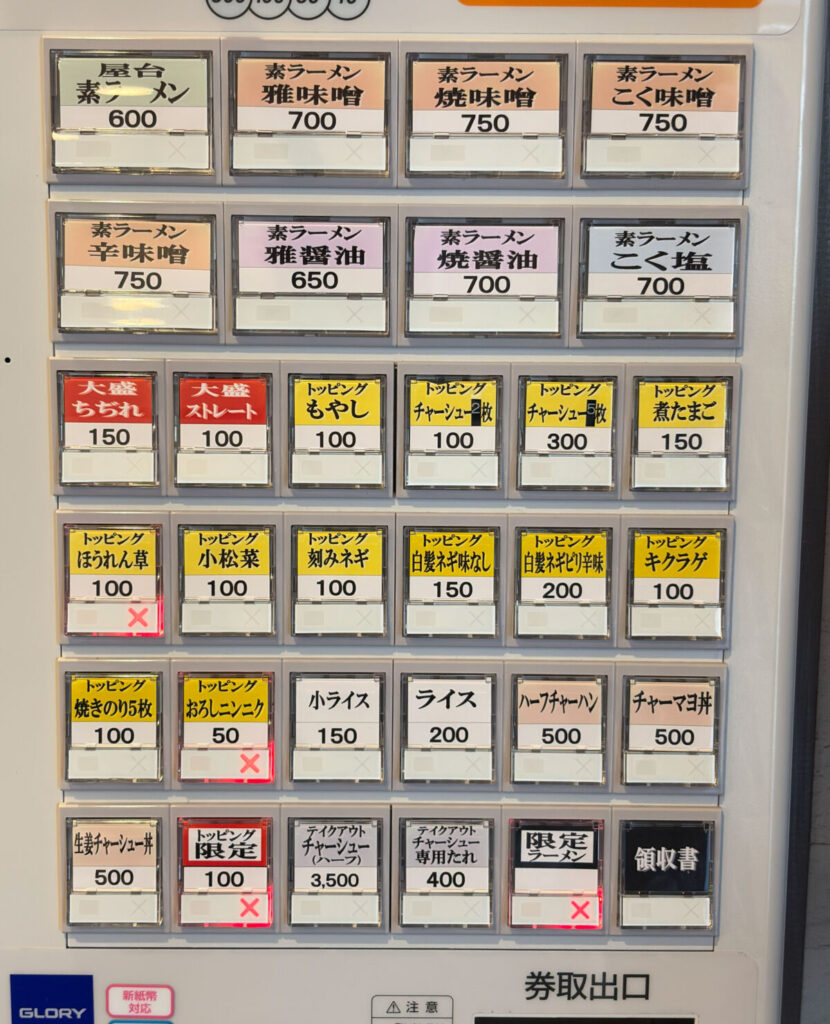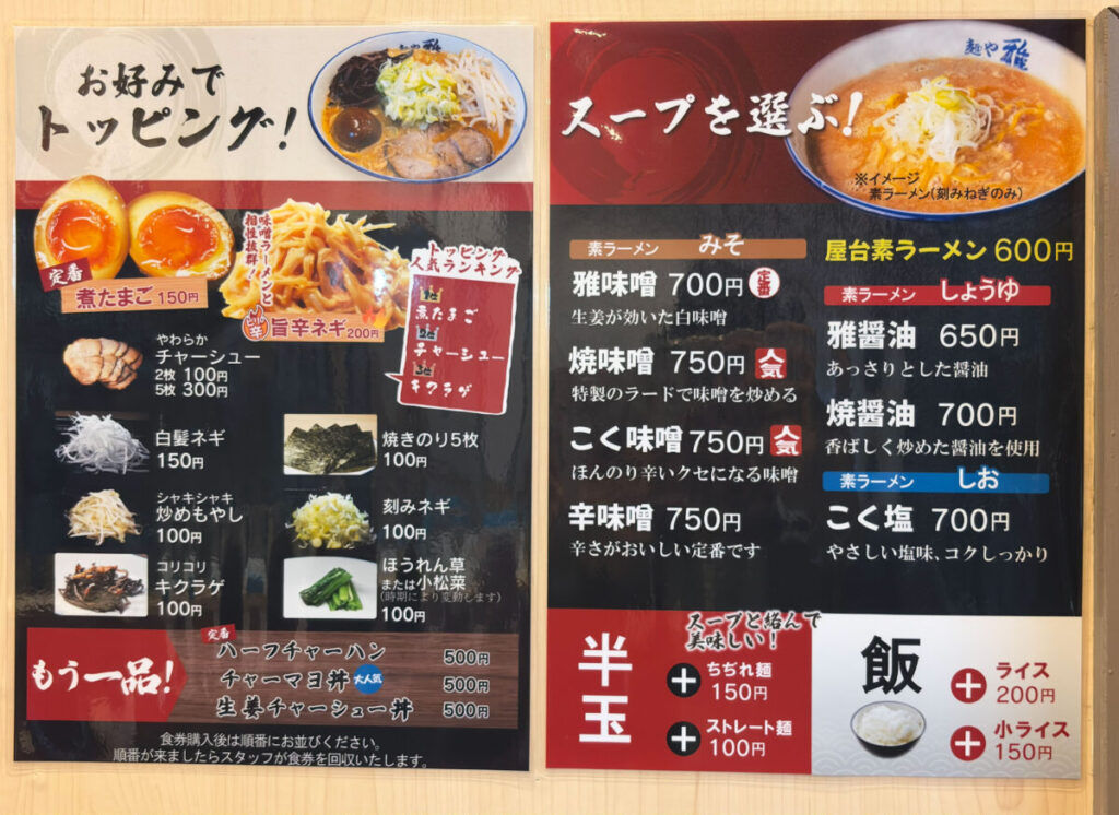 注文は食券制で、メニューはこんな感じ。刻み葱のみの素ラーメンに、お好みでトッピングしてカスタマイズしていきます。