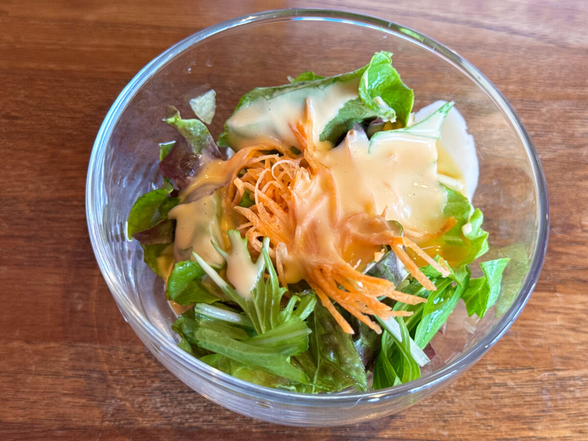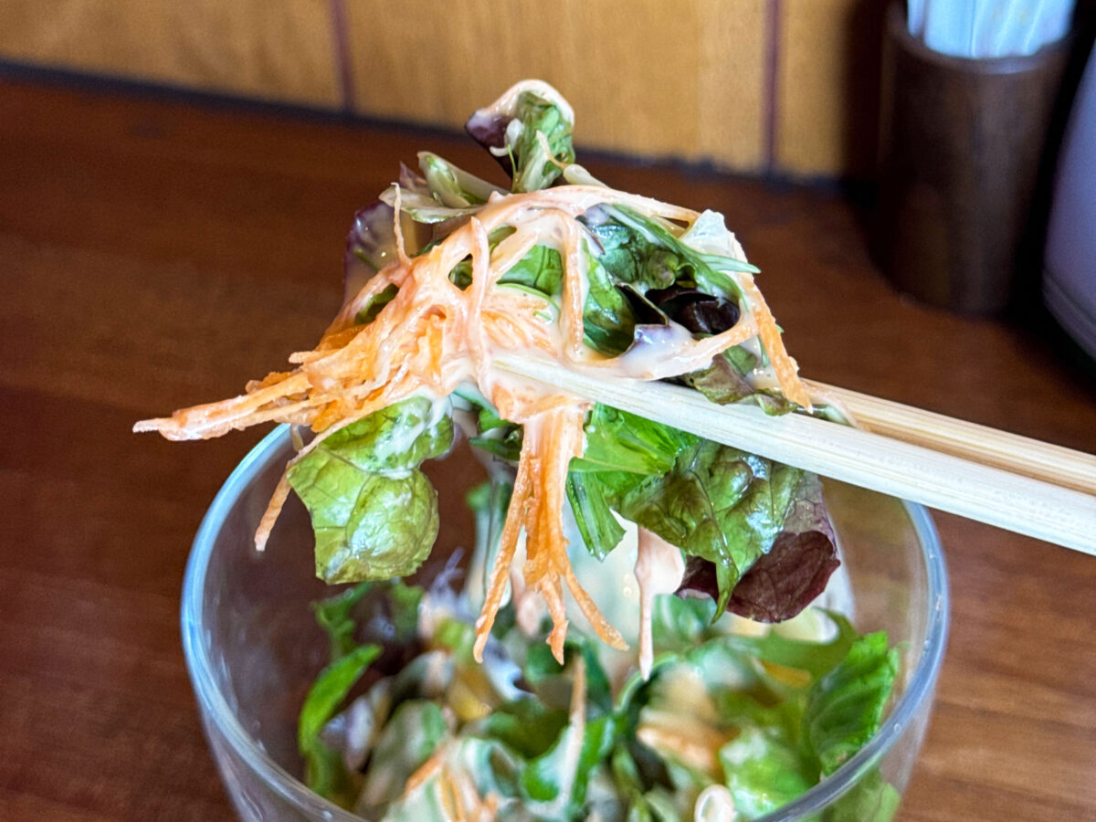 サウザンドレッシングでシャキシャキ生野菜、どんどん進む〜!