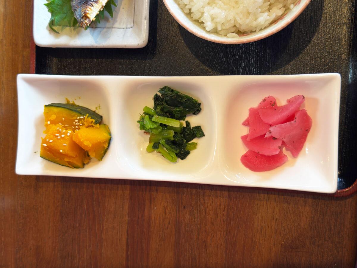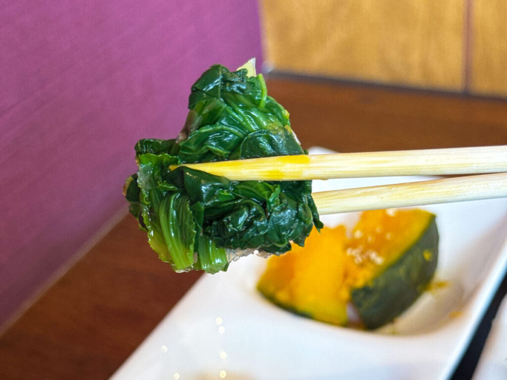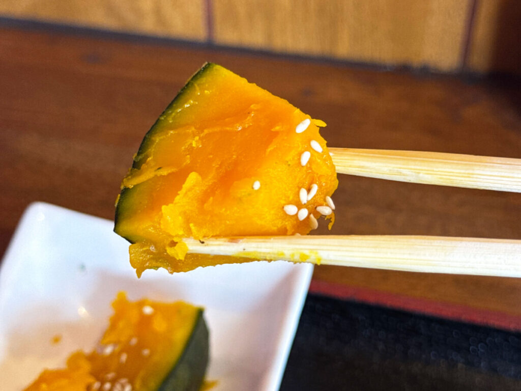 かぼちゃの煮物はしっとり優しい甘さ。小松菜のお浸しはシャキッと♪