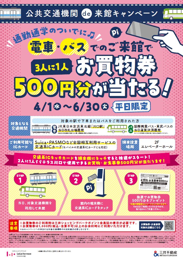 「公共交通機関de来館キャンペーン」は、平日限定で電車・バスで来館し交通系ICタッチカードを端末機にタッチすると、3人に1人、お買い物券500円が当たる抽選。今回は4月1日から6月30日まで開催とのこと。