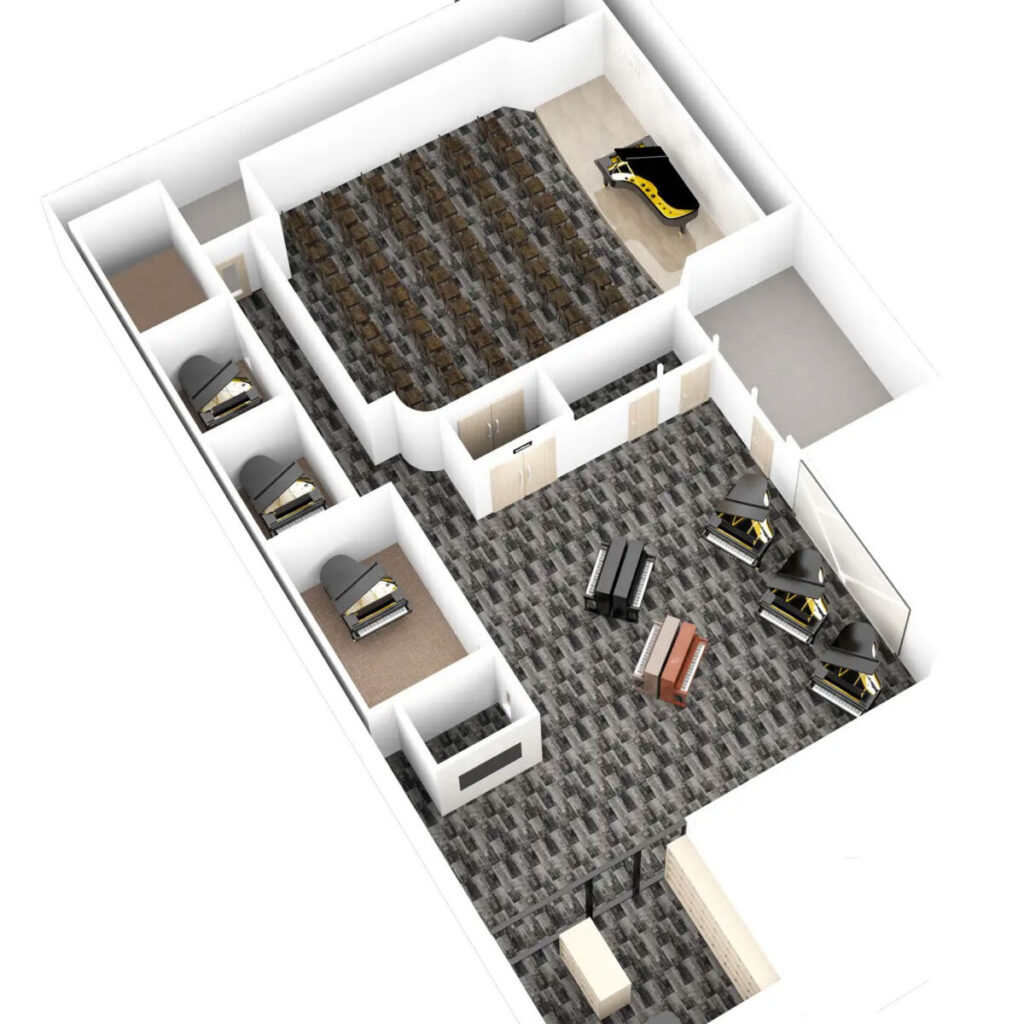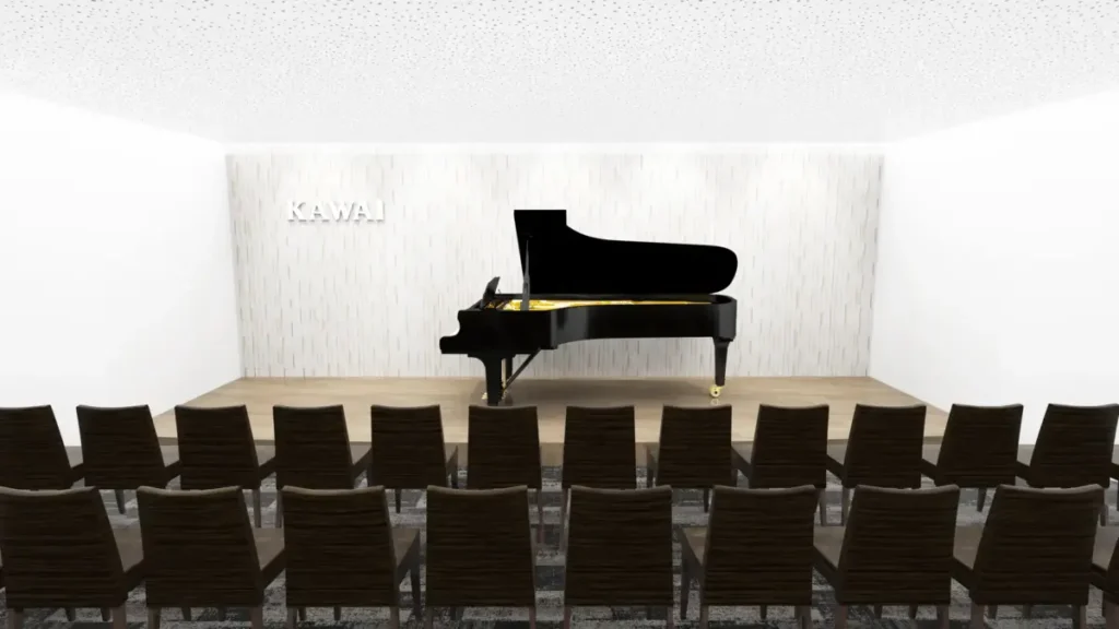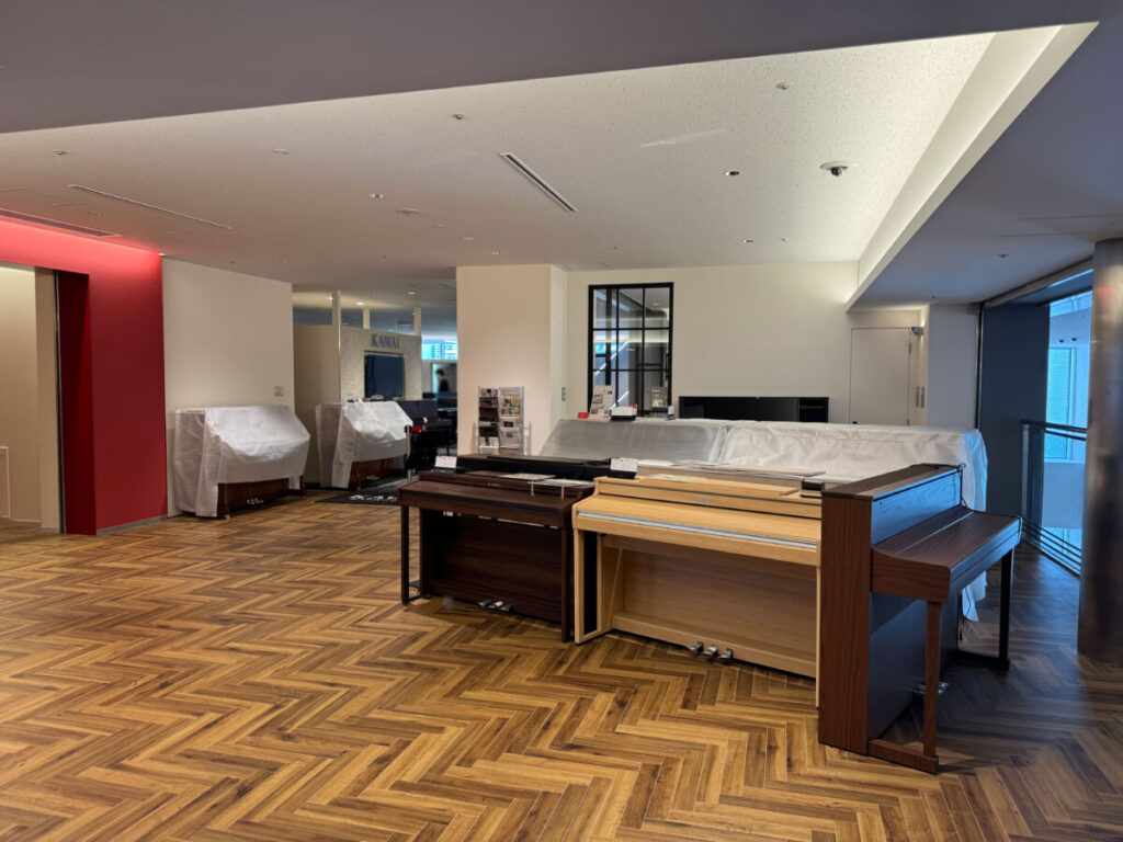 高付加価値ピアノの展示・販売に加え、豊富な楽譜を取り揃えているほか、ピアノレッスンに適した環境を備えた「カワイ音楽教室」や、約100名を収容できるミュージックサロン「Le Mieux(ル・ミュー)」も併設されているそうです。
