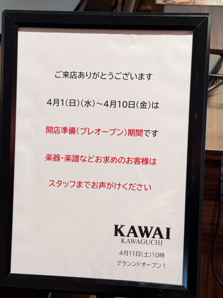 店頭に「4月1日(水)〜4月10日(金)は 開店準備(プレオープン)期間です 楽器・楽譜などお求めのお客様はスタッフまでお声がけください 4月11日(土)グランドオープン」というお知らせが出ていましたよ。