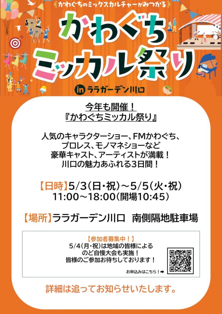 今年も、5月3日(日)から5日(火・祝)まで、ララガーデン川口で「かわぐちミッカル祭り」が開催されるみたい。