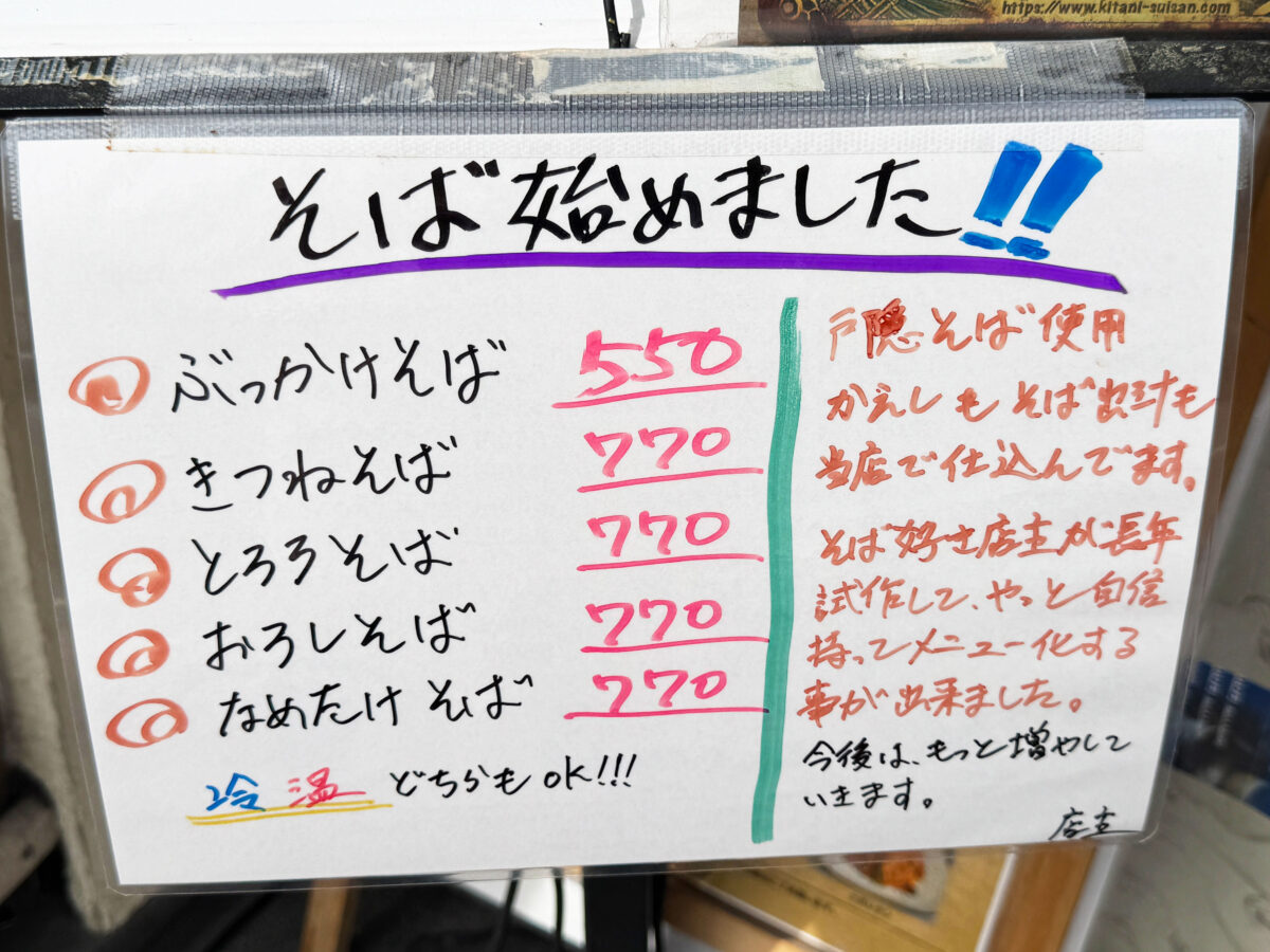 店頭にあったメニューがこちら。「そば始めました!!」とのこと。