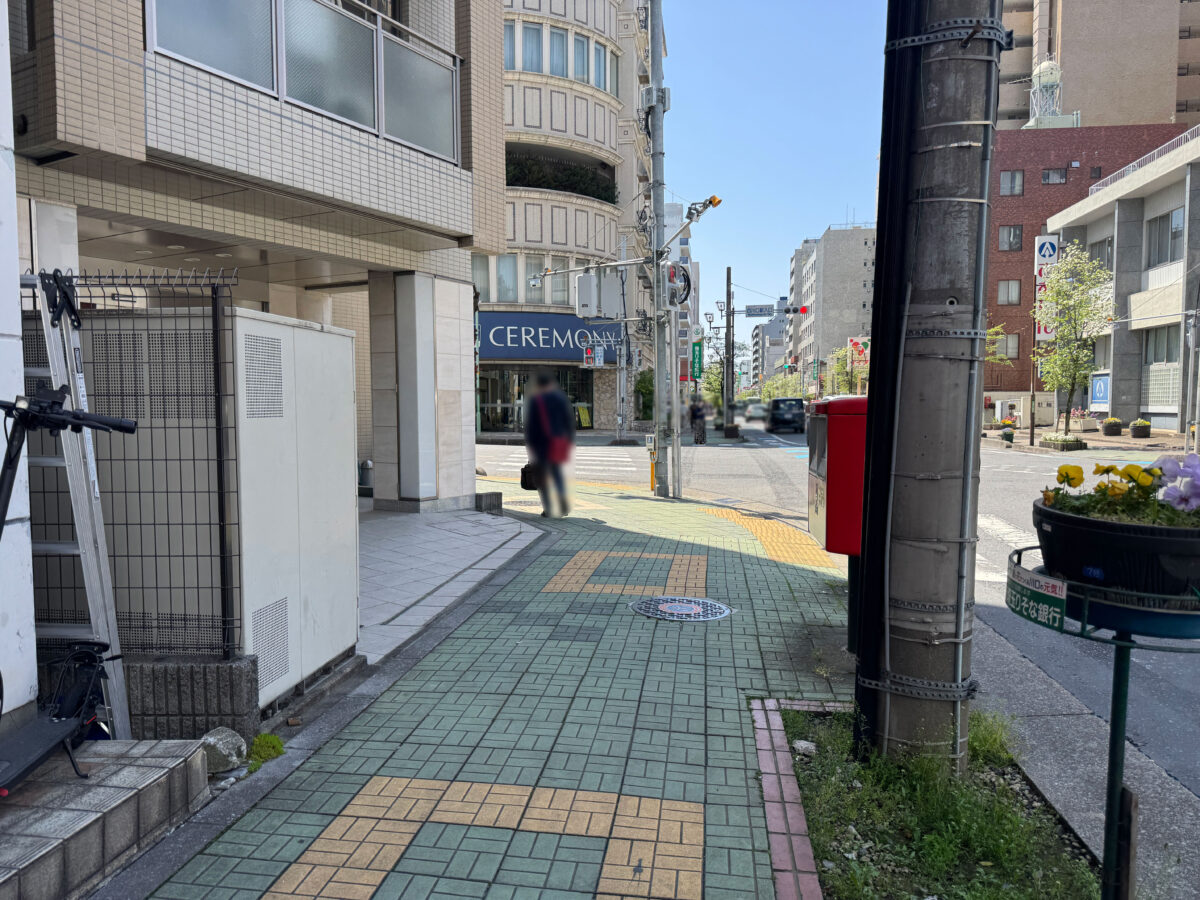 左は西川口駅方面。「セレモニー西川口ホール」や「青木信用金庫」などがあります。