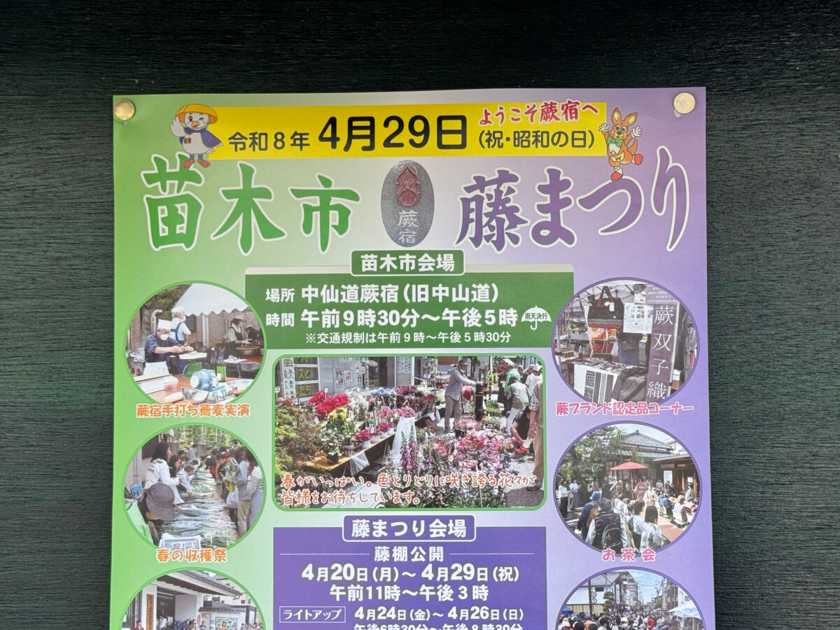 【蕨市】「苗木市 藤まつり」が開催されるみたい!藤棚のライトアップも!中仙道蕨宿で「苗木市 藤まつり」が4月29日(水・祝)が開催されるみたい!掲示板にポスターが掲示されて...