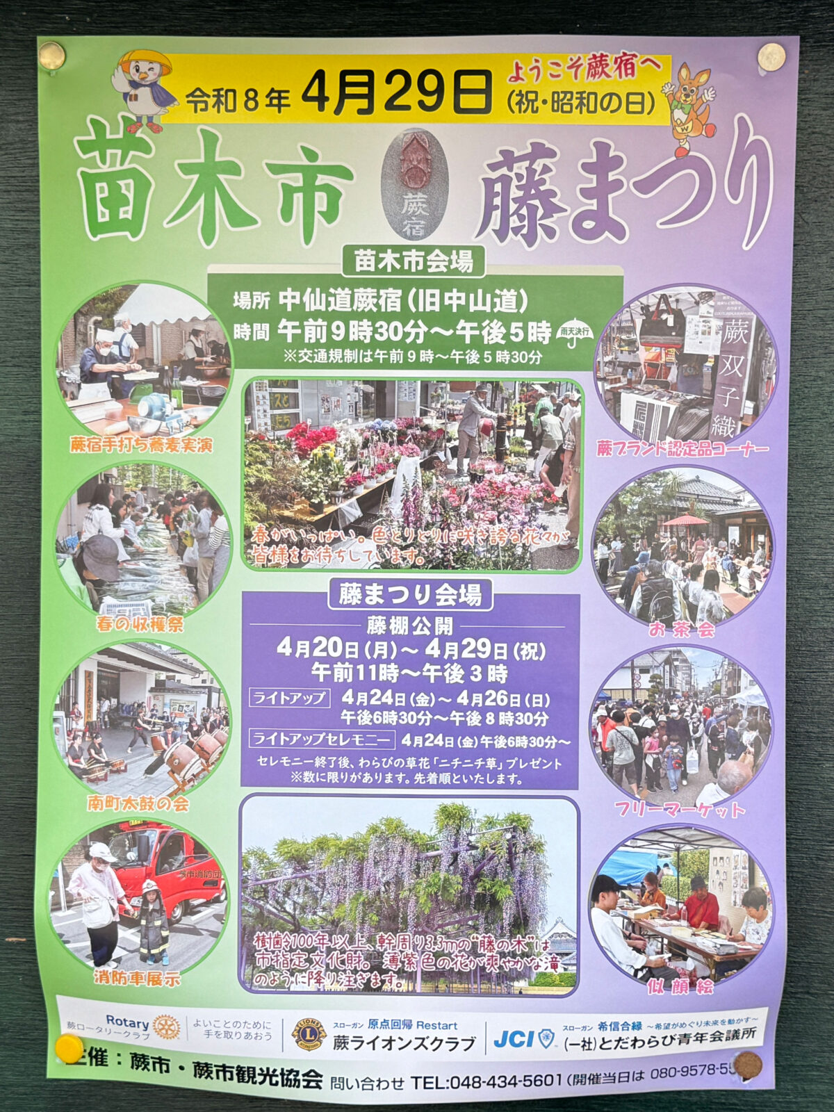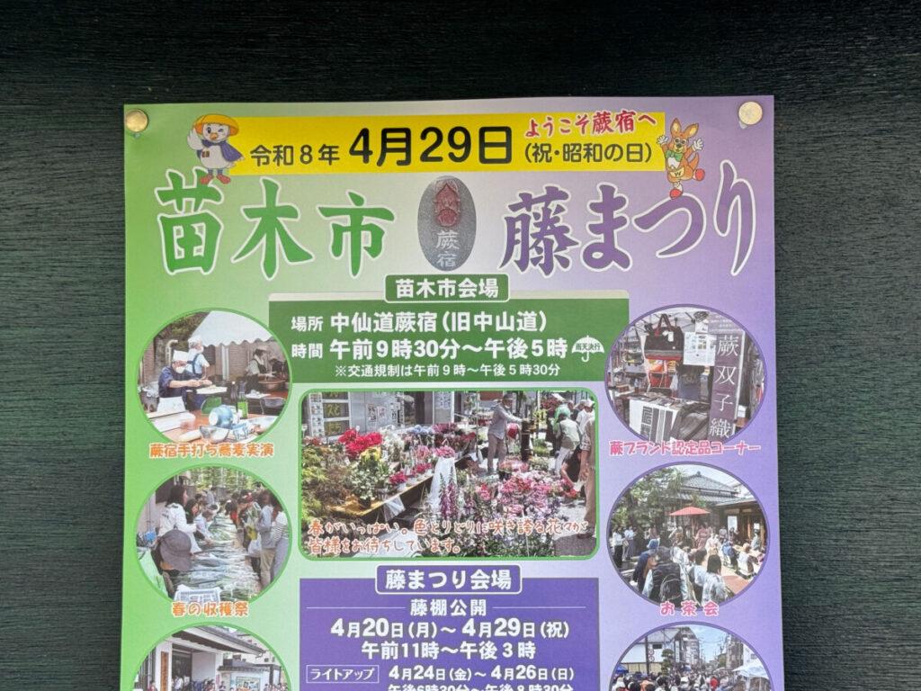 中仙道蕨宿で「苗木市 藤まつり」が4月29日(水・祝)が開催されるみたい!掲示板にポスターが掲示されていましたよ!