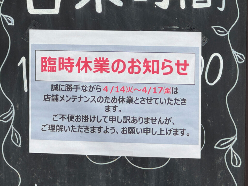 店頭に「4/14(火)〜4/17(金)は 店舗メンテナンスのため休業させていただきます。」という臨時休業のお知らせがでていましたよ。