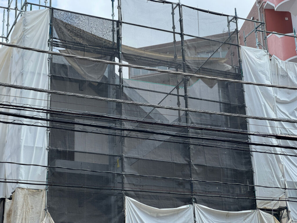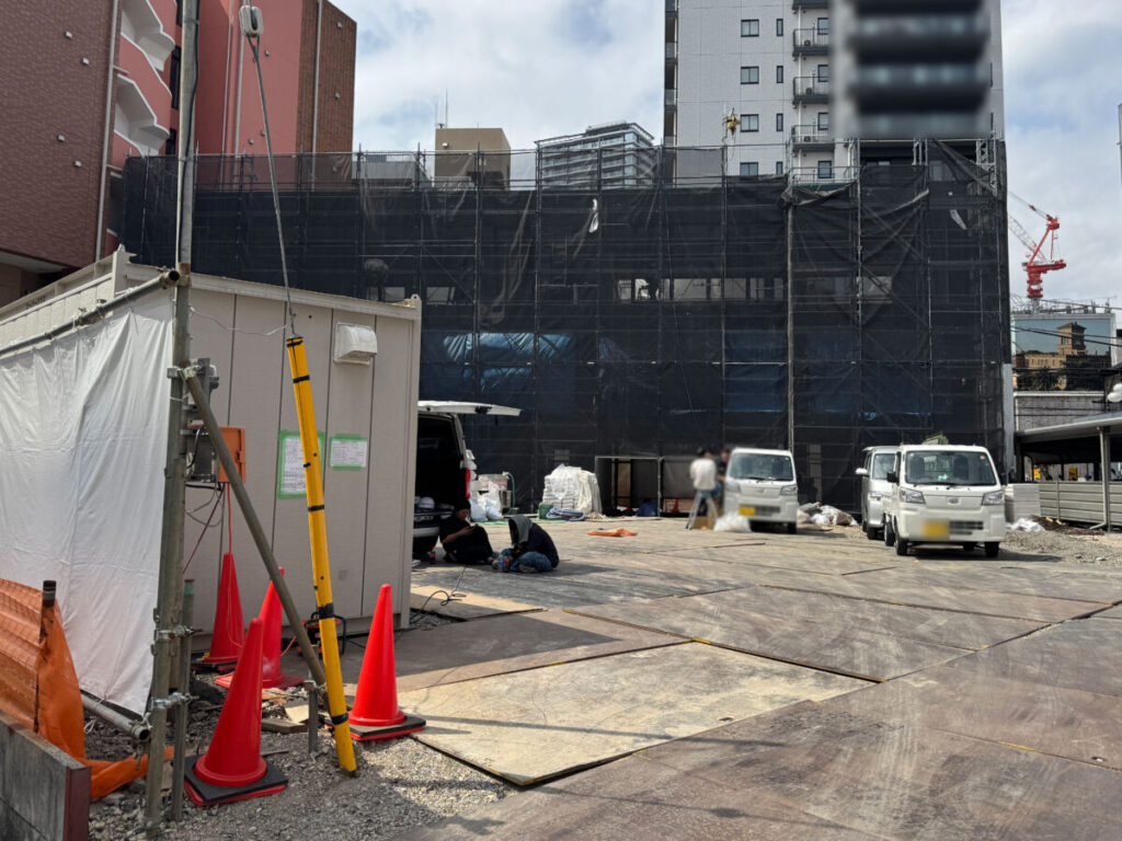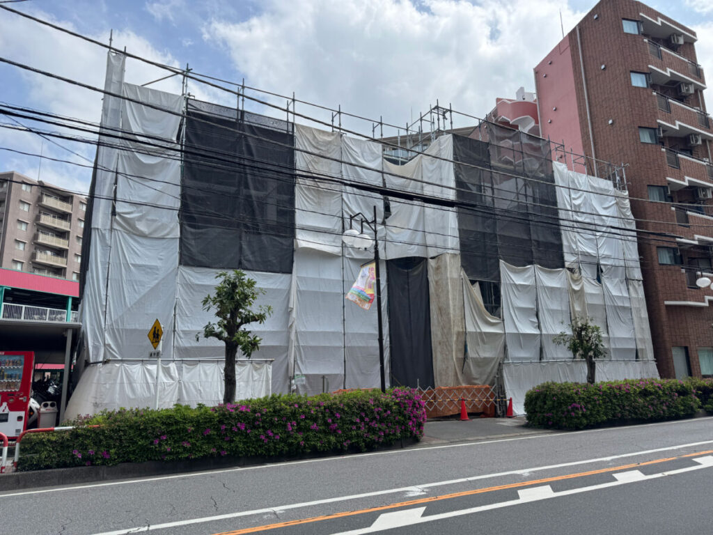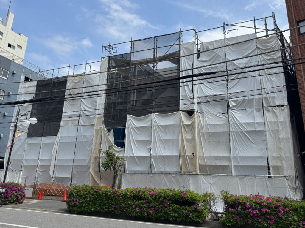 そして4月14日(火)現地の様子。足場が組まれ、長方形のフォルムの建物が姿を現してきました。