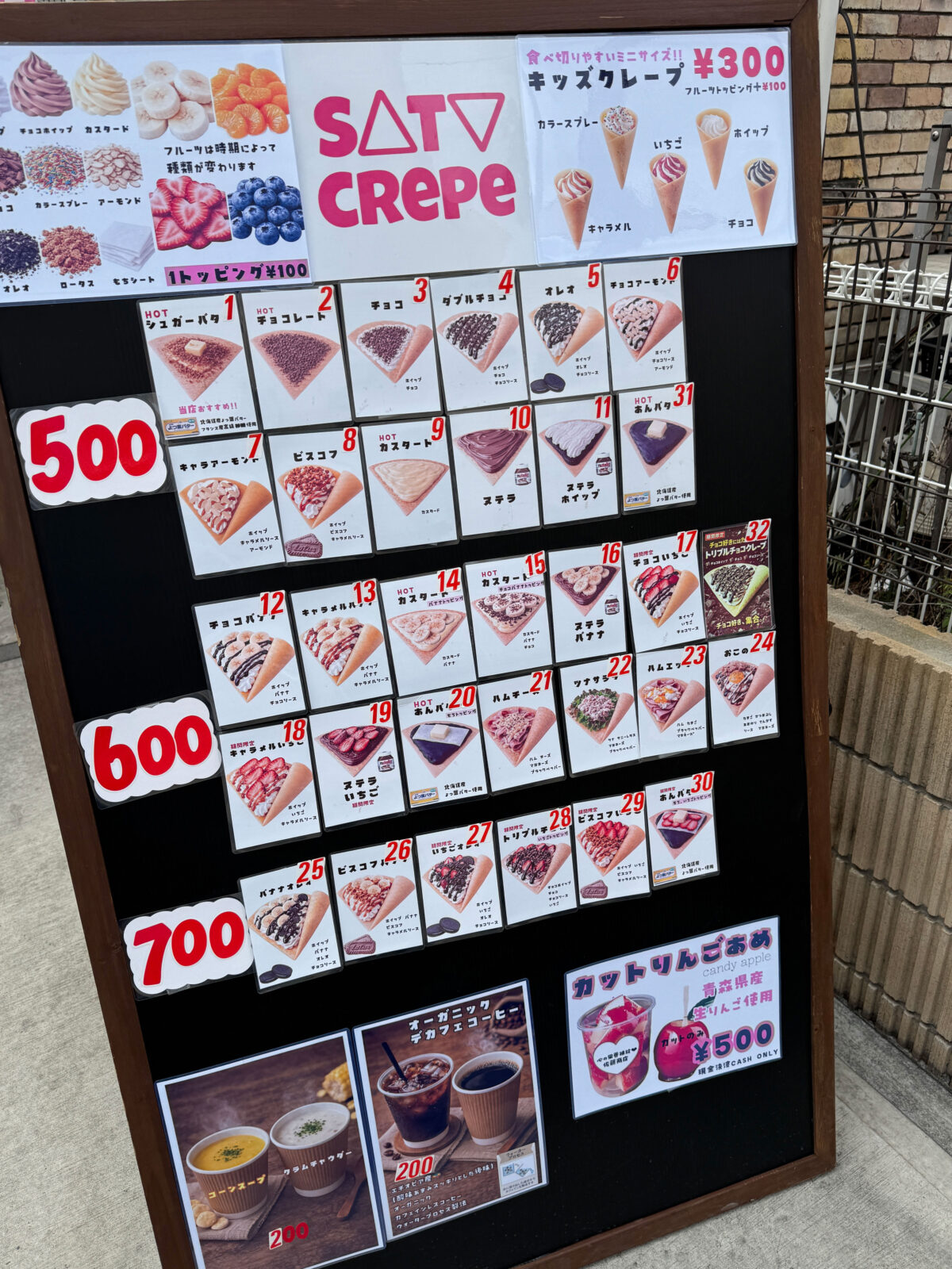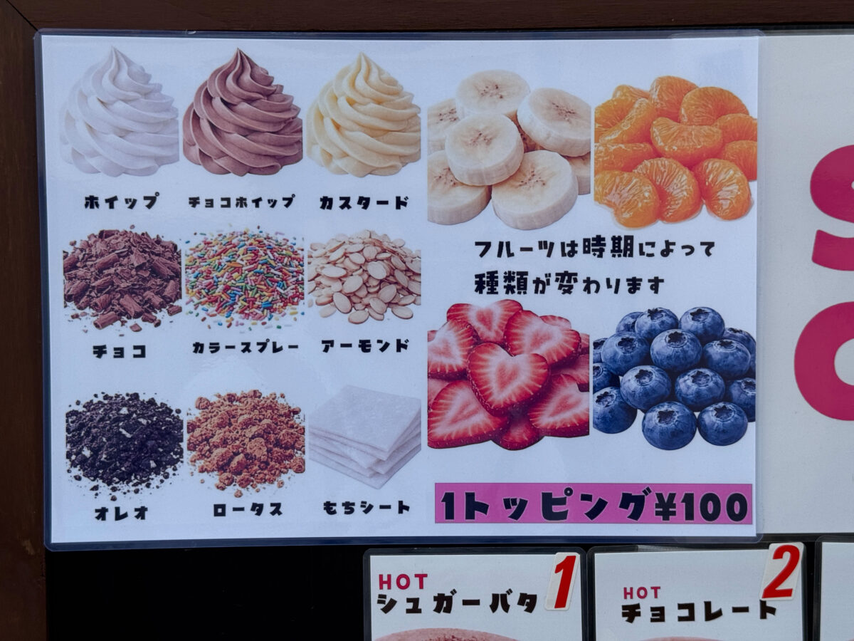 クレープのトッピングは1つ100円で追加できるみたい!