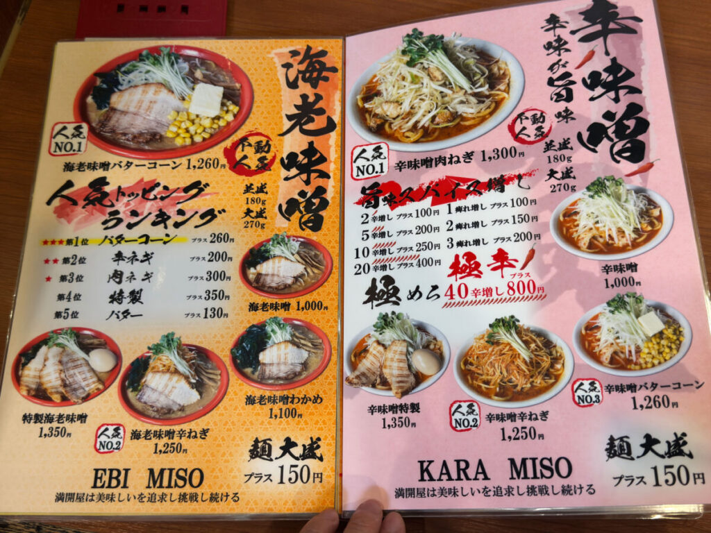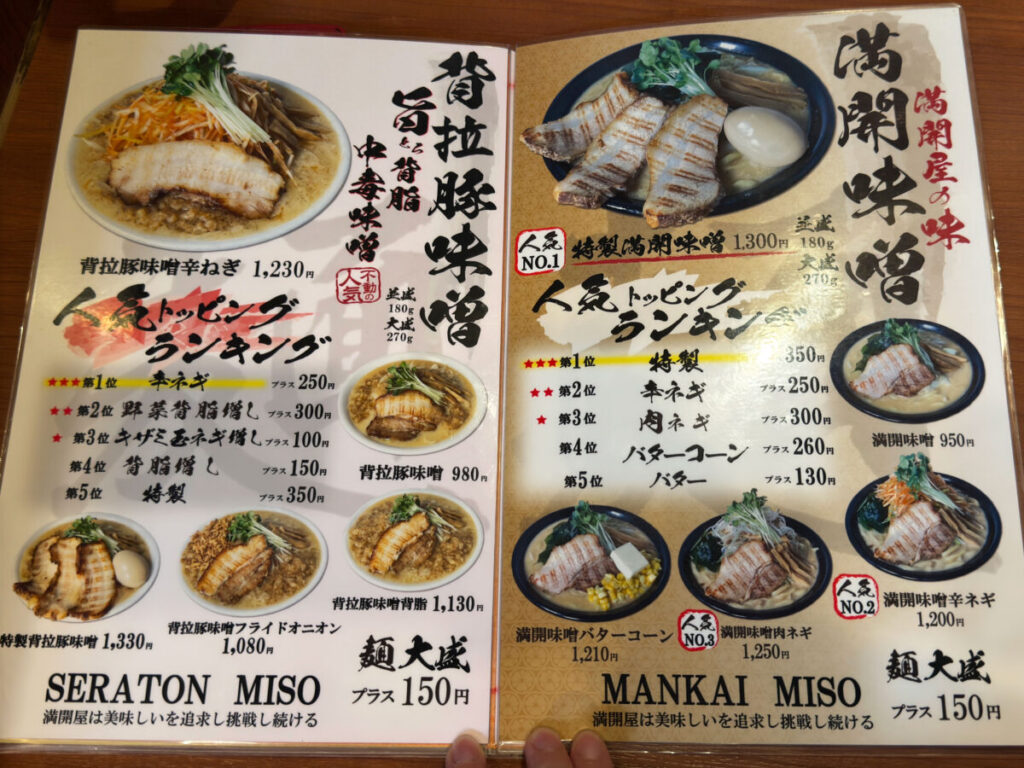 メニューはこちら。満開屋はとにかくラーメンの種類がたっくさん!人気No,1は「特製満開味噌」だって。