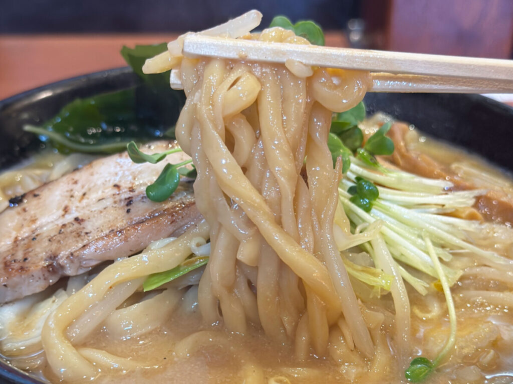さあ、麺を持ち上げてみると、太麺!まるでうどんのようです。