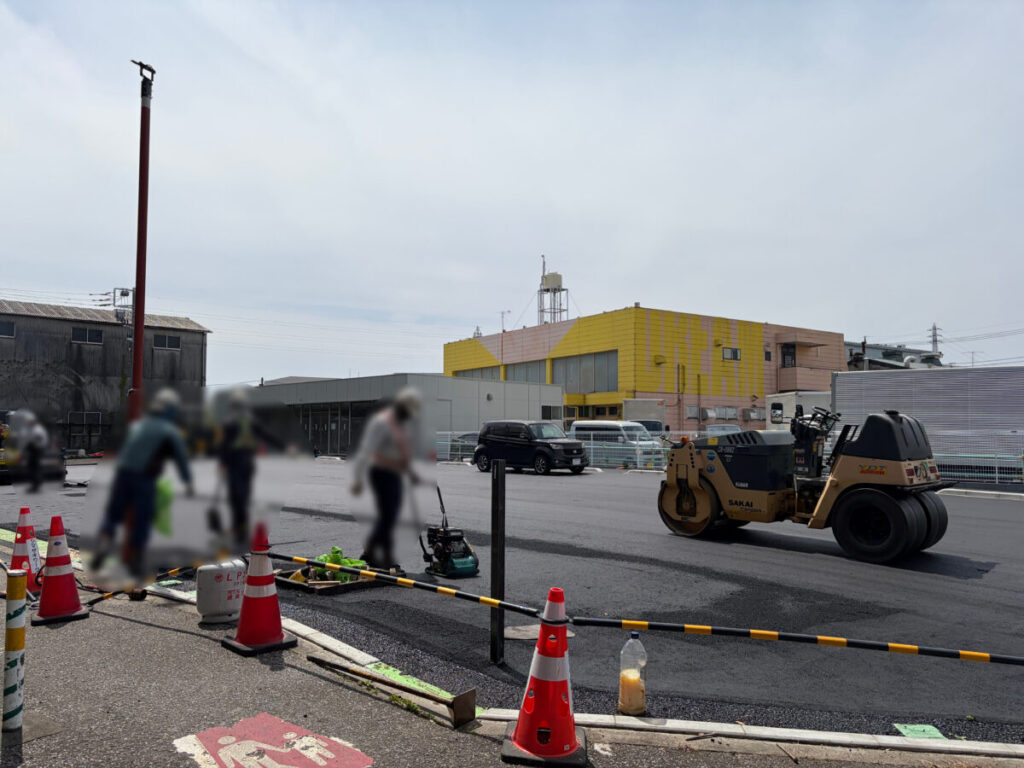 かなり広いスペースにアスファルト工事が入ってます。駐車スペースかな?