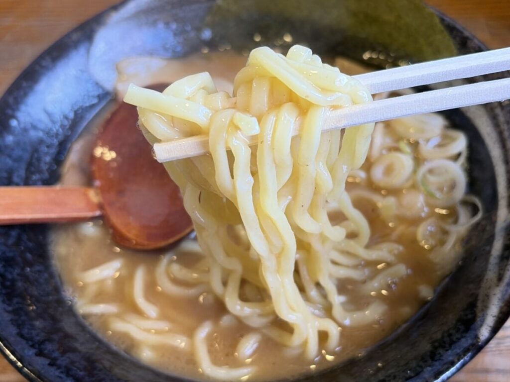 そして、ツルモチ太麺にドロっとスープがよく絡む♪