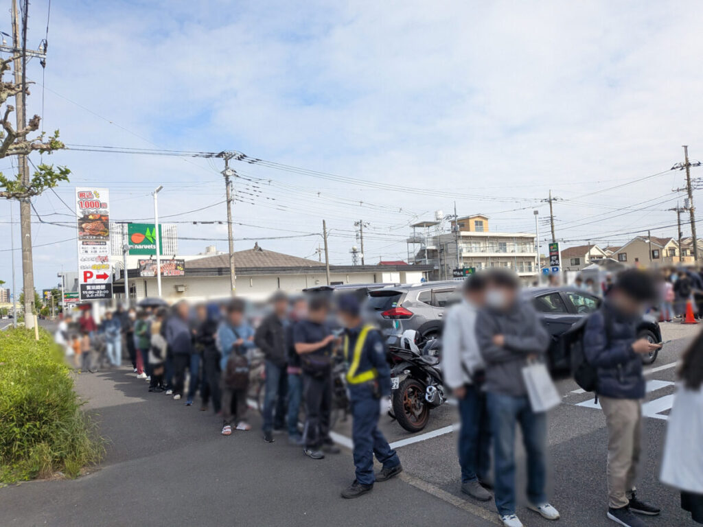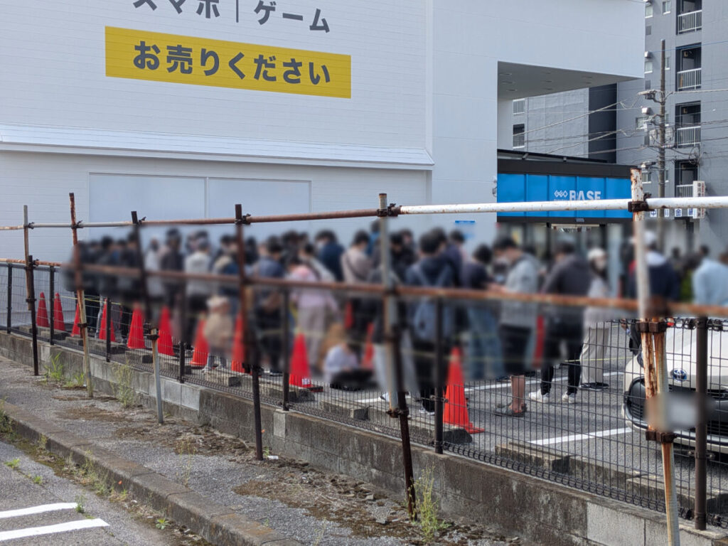 店舗前の道沿いに行列。こちらはトレカ以外の購入列。