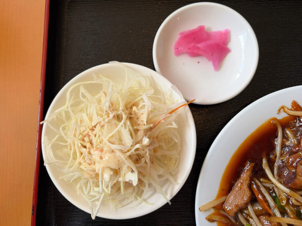 サラダに、お漬物、そして日替わりの揚げ物がついてくる!