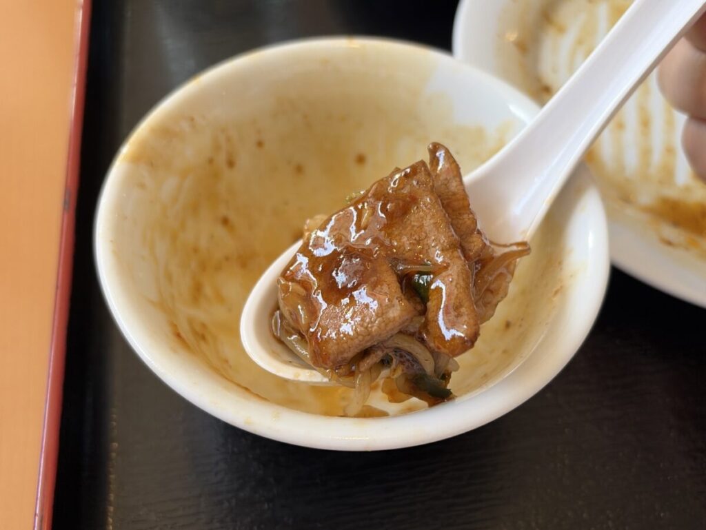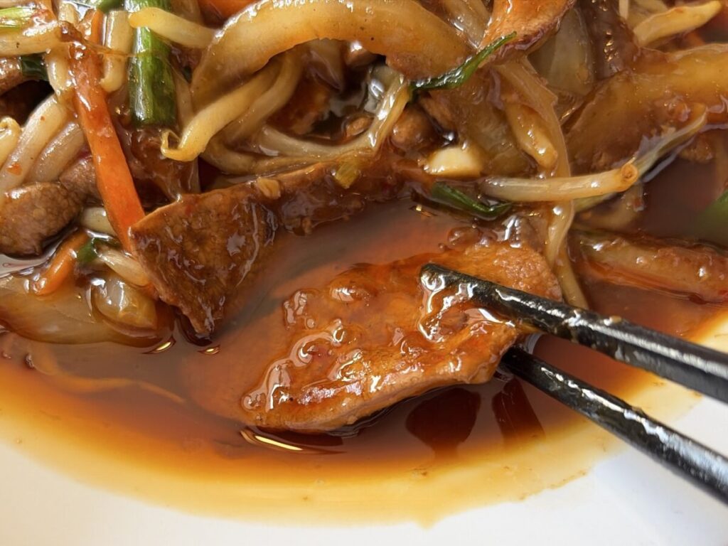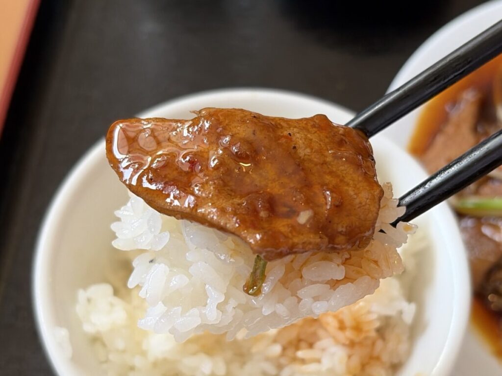 そしてちょっと辛そうな見た目のタレがたっぷり!中華のニラレバと全然違うぞ!